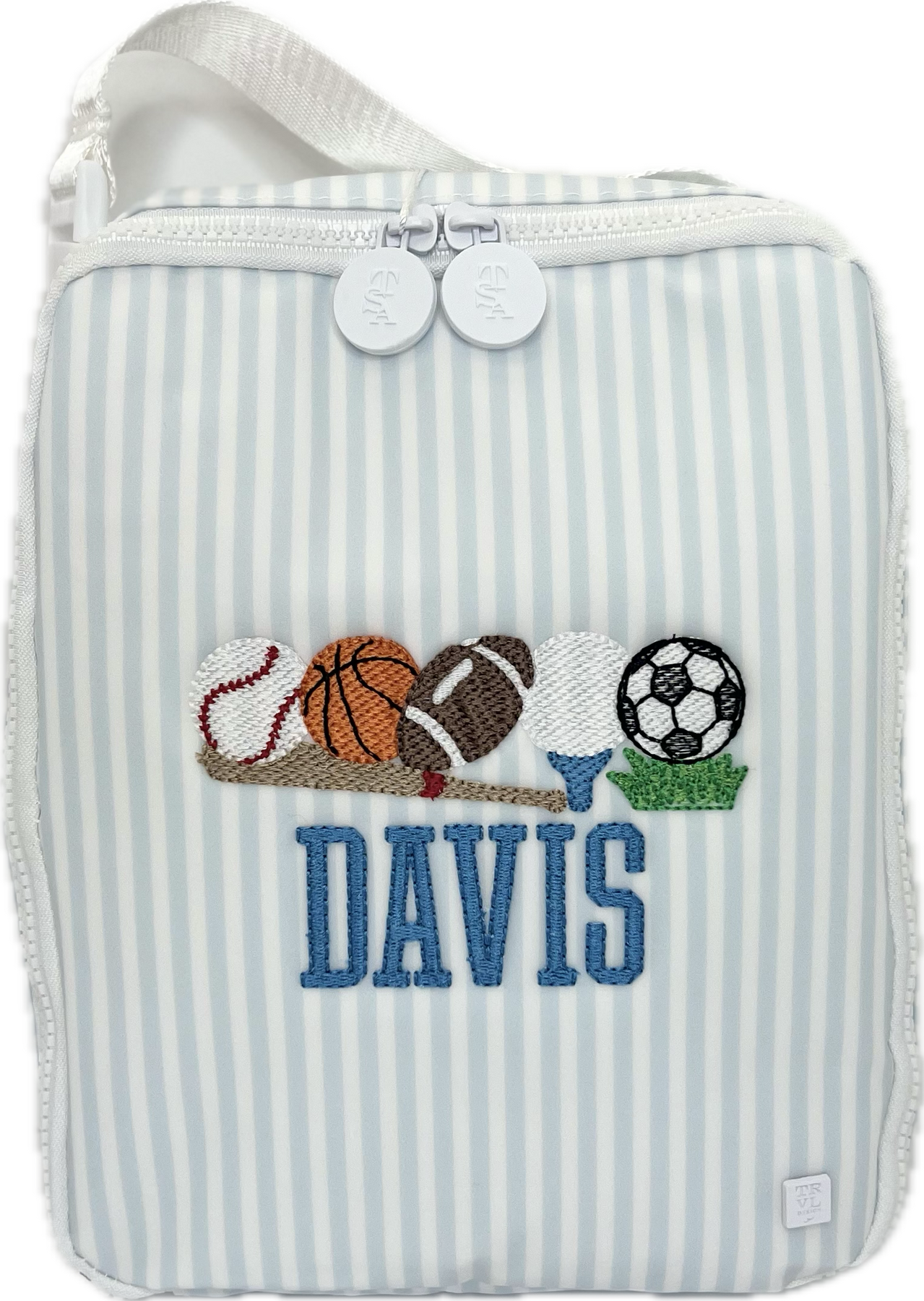 The Lunch Box Pimlico Stripe Light Blue by TRVL Design is perfect for those on the go. This lunch bag is designed to be both stylish and practical, featuring a slim fit that easily packs into any backpack. Its top handle with a buckle closure allows for easy attachment to a stroller or another bag, providing hands-free convenience.