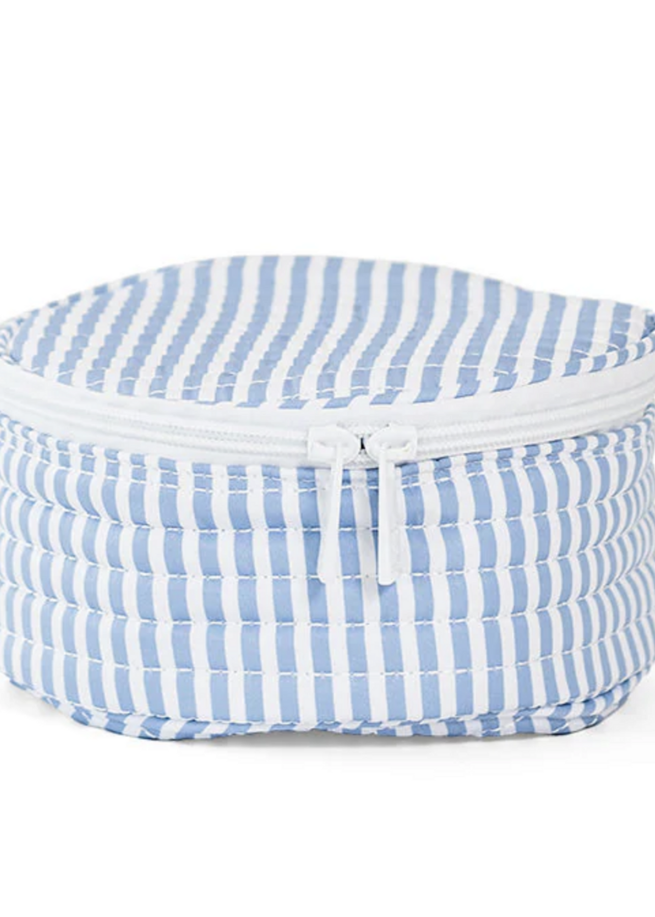 The Quilted Jewelry Round from TRVL Design is an ideal accessory for organizing your jewelry collection, featuring an elegant Pimlico Stripe Chambray design. This lightweight and spacious jewelry case is perfect for storing earrings, necklaces, rings, and bracelets, thanks to its elasticized compartments around the outer edge.